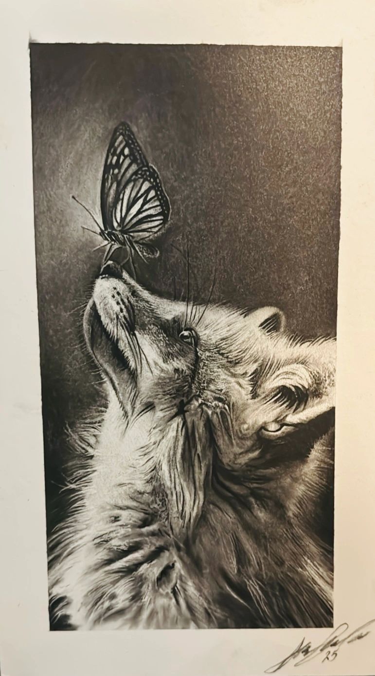 Created for his daughter, this piece reflects the artist’s message about balance in life. The fox represents strength and protection, carefully built through patient, detailed strokes, while the butterfly symbolizes gentleness and curiosity.